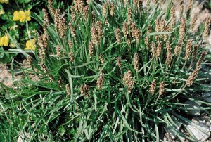 Toutes les nombreuses feuilles des rosettes sont étroites (comme des feuilles de graminées) et charnues (≠ autres espèces de plantain). L'aspect des touffes de feuilles fait penser à un "hérisson". Les nombreuses inflorescences sont allongées en forme de cylindre (≠plantain noirâtre).