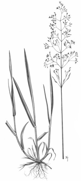 - Tiges fines souvent pliées et dressées, surmontées d’épis aériens faits de nombreux rameaux fins comme des cheveux. Épillets issus d’une seule fleur souvent rouge-brun.