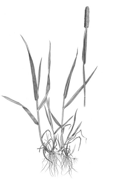 Forme grâce à ses stolons souterrains des taches lâches dans le gazon. Feuilles bleu-vert, glabres, «grasses» au toucher. Base des feuilles légèrement ciliée et gaines foliaires supérieures gonflées. Tiges portant un épi ovale à cylindrique, nettement plus court que celui de la phléole des prés. Épillets en forme de bottines avec deux arêtes (≠ vulpin des prés). Fleurit tardivement en été.