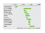 La fenêtre temporelle à laquelle une graminée atteint ce stade est très large entre les espèces les plus précoces et les plus tardives. Pour les variétés de 12 graminées fourragères différentes recommandées en Suisse, cette période s’étend en plaine sur une dizaine de semaines entre début avril et mi-juin.
