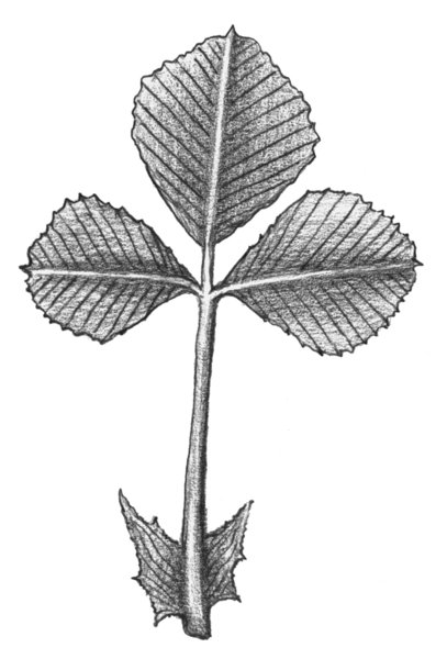 - Feuille trifoliée. Folioles arrondies en forme d’œuf retourné, poilues, evc une nervure centrale disparaissant à la pointe. Foliole médiane pétiolée.