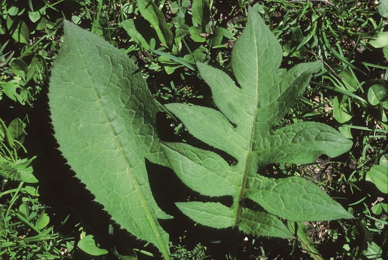 - Foglie basali picciolate, lanceolate, intere o profondamente incise. Picciolo a sezione triangolare e profondamente solcato. Foglie caulinari superiori sessili, con base della lamina a forma di cuore e abbracciante il fusto.