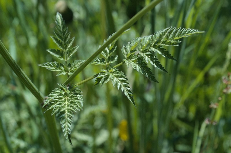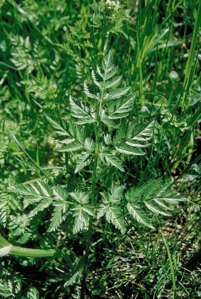 - Foglie inferiori per lo più tripennate e con margine dentato. Normalmente, le foglioline di secondo ordine sono da quattro a più coppie, a loro volta formate da foglioline di terzo ordine profondamente incise (≠ dal cerfoglio irsuto). Le prime due coppie di foglioline di secondo ordine sono picciolate (≠ dal cerfoglio irsuto).