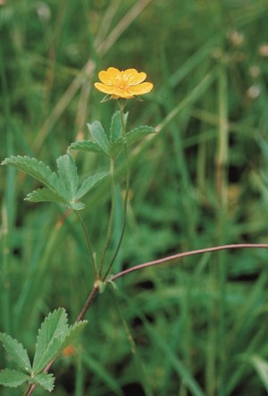 - Il cinquefoglie fior d’oro (Potentilla aurea) è una specie strettamente imparentata presente sul piano alpino. Risulta interessante per il suo sapore anche se è poco produttiva. La si trova nei prati e pascoli magri, in particolare nel pascolo a nardo. Nelle superfici per la promozione della biodiversità (SPB) riveste un ruolo di specie indicatrice analogo a quello di P.reptans. Valore ecologico: fonte alimentare per i bruchi del lepidottero pirgo della cacalia (Pyrgus cacaliae).