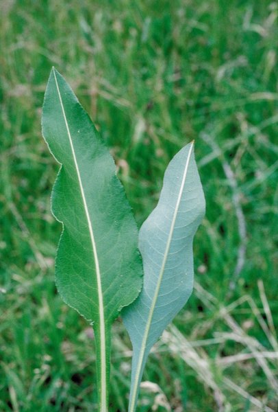 - Foglie basali lungamente picciolate, da oblunghe a lanceolate, lunghe fino a 20 cm, verde scuro sulla faccia superiore e glauche su quella inferiore.