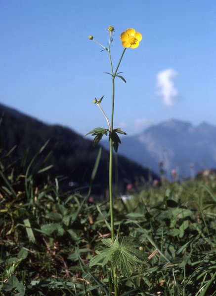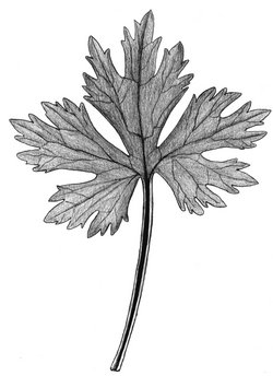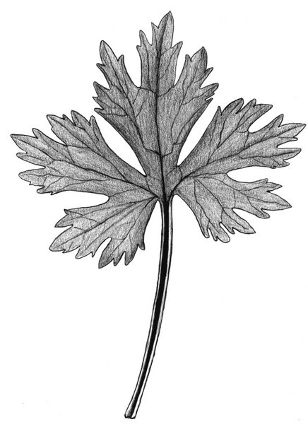 - Foglie basali lungamente picciolate, semplici, a forma di stella e con lamina più o meno profondamente incisa a definire 3 – 5 lobi irregolari. Le foglie caulinari superiori sono sessili.