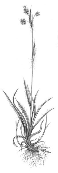 Fusto eretto, cilindrico e non ramificato, che porta, all’apice, alcuni glomeruli a forma di spiga. Spighetta terminale solitamente sessile; spighette laterali peduncolate e pendule nel periodo della maturità del seme. Foglie basali erbacee e foglie del fusto brevi, coriacee e con lunghi peli sul margine. Grazie ai suoi stoloni ipogei forma tappeti radi.