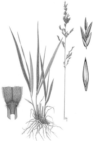 Forma cespi fitti e fogliosi, da piccoli a grandi. I fusti raggiungono il metro d’altezza, non presentano apparentemente nodi (questi sono concentrati alla base del germoglio) e terminano con pannocchie lasse, piuttosto strette e lunghe fino a 30 cm. Le antere delle spighette, prive di resta, sono di colore violetto scuro. Fiorisce in tarda estate. Le foglie sono lunghe, scabre, grigio-verdi, assottigliate alla base e con larghezza massima nel punto medio della lamina (foglia ensiforme-lanceolata). La ligula è sostituita da una corona di peli.