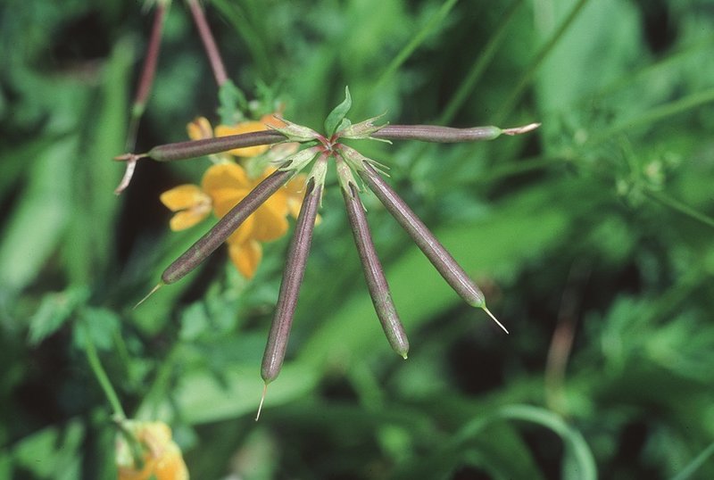 - Fiori gialli (in parte rossicci prima dell’antesi), riuniti in numero di ~5 in capolini lassi. Fiorisce dalla primavera all’autunno. Legumi cilindrici, lunghi e sottili.