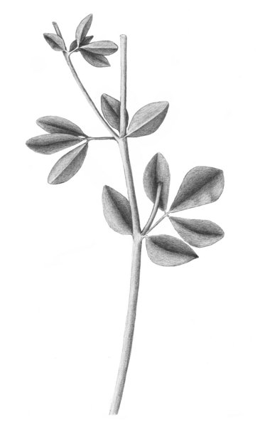 - Foglia costituita da 5 elementi: tre foglioline, tipiche delle leguminose, e due stipole, opposte e sessili, alla base del picciolo fogliare. Foglioline e stipole sono quasi uguali (spesso sono leggermente asimmetriche).