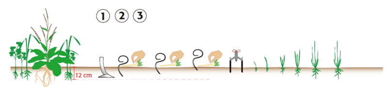 3. Dopo ogni passaggio, lasciare seccare radici e rizomi sul posto oppure raccoglierli manualmente, quindi eliminarli secondo le regole. La raccolta manuale si può evitare solo se fa molto caldo e si è sicuri che i romici siano morti. Non lasciare mai in campo romici ancora vitali!