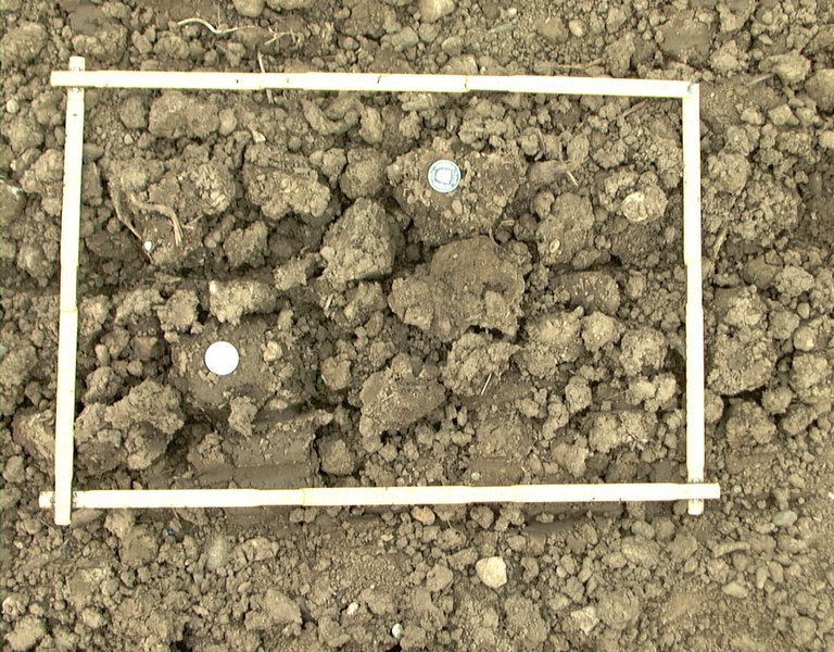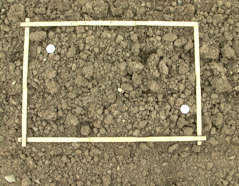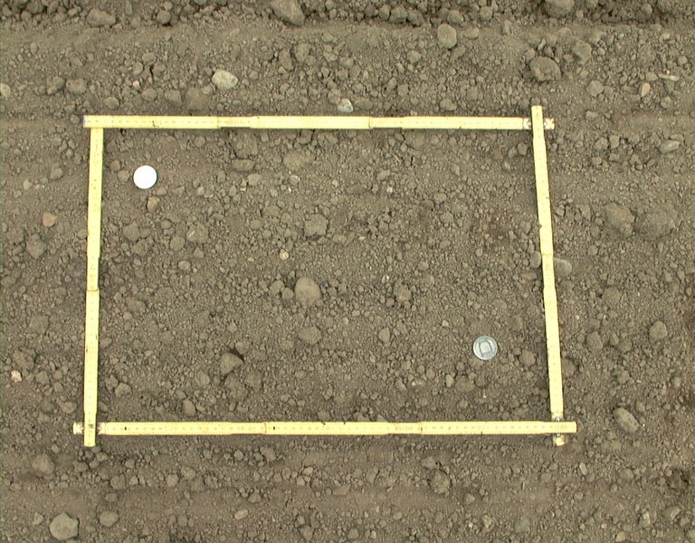 Falten Sie einen Doppelmeter zu einem Rechteck von 40 x 60 cm. In diesem Rechteck sollten noch etwa 20 Fünfliber-grosse Schollen vorhanden sein. Diese Schollen schützen den Boden vor Verschlämmung und Erosion.