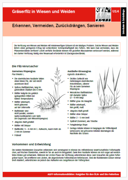 Wiesen und Weiden sind nicht selten verfilzt mit minderwertigen Gräsern. In diesem Zustand sind sie ertragsschwach und ihr Futter ist nicht schmackhaft. Verursacher des Übels sind in der Regel die filzbildenden Gräser Gemeines Rispengras Poa trivialis und/oder Ausläufer-Straussgras Agrostis stolonifera. Im neuen AGFF-Informationsblatt U14 «Gräserfilz in Wiesen und Weiden» erfahren Sie, wie man vermeiden kann, dass sich Pflanzenbestände verfilzen, wie man leicht verfilzte Flächen mit gezielten Massnahmen verbessert und wann nur noch eine Neuansaat aus der Sackgasse hilft. Das Informationsblatt ergänzt die bisherige Beschreibung dieser Gräser in eAGFF.