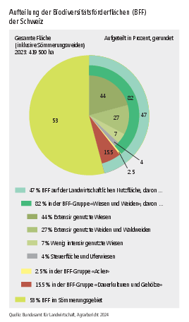 Die Veränderungen in den letzten fünf Jahren sind gering. Einzig die flächenmässige Ausdehnung der Biodiversitätsförderflächen im Grasland um ~13 000 ha (+ 3.5%) fällt auf.