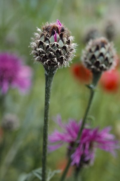Blütenkopf mit grün-schwarzen Hüllblättern (≠ Wiesen-Flockenblume), erinnern an Dachziegel.