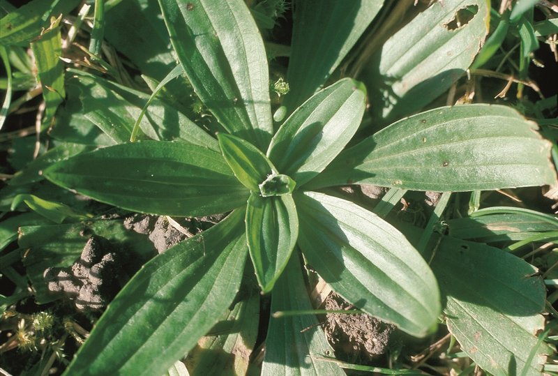 - Alle Blätter bilden eine Rosette, sind länglich-lanzettlich, ganzflächig und zeigen auffällige Längsnerven (meist 5). In Weiden sind die Blätter nur kurz gestielt und breiter, in Mähwiesen deutlich gestielt und länger.