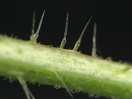 - Ebenfalls Schutz vor dem Gefressen-Werden durch Nutztiere oder mindestens eine deutliche Reduktion der Fress-Attraktivität bieten den Pflanzen „wollig-filzige“, harte, spitze, scharfkantige Strukturteile oder Drüsen mit ätzenden oder brennenden Inhaltsstoffen: Haare, Dornen.